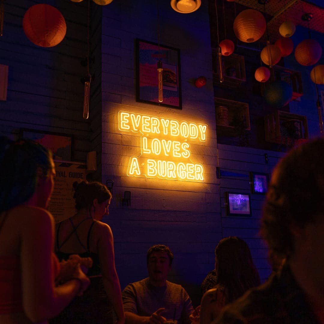 Vintage American automotive artwork and yellow neon signage above the ordering station reinforce the roadside Americana theme. The seating is casual — a mix of standard tables and chairs arranged canteen-style rather than formal table service. TV screens line the walls, and the glass-fronted entrance onto Albion Street gives the space a street-level energy that spills in from outside. On weekend evenings, the atmosphere runs loud and buzzy, with music competing against the chatter of a packed room. The venue has wheelchair-accessible entrance and seating throughout.